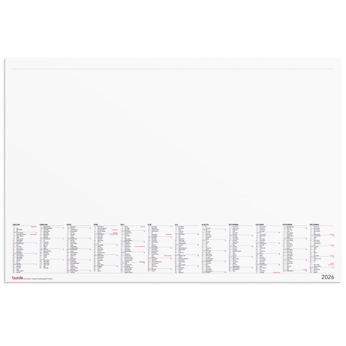 Skrivunderlägg/kalender Elegant från Burde. Detta praktiska skrivunderlägg har både kalendarium samt mycket utrymme för egna noteringar. Du får ett block om 20 blad som är limbundet i nederkant. --Kalender 2026 från Burde --Format: 600x400 mm --Layout: År/blad. Limbunden. --Kalendarium: 2026-01-01–2026-12-31 --Innehåll: Helgdagar, Namnsdagar. --Antal sidor: 20 --Miljöinformation: FSC®