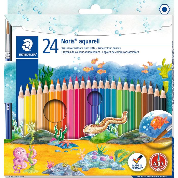 Noris Club® Akvarellpenna i pappask med färgpennor + pensel. Sexkantig akvarell-färgpenna av hög kvalitet för färgläggning med många möjligheter - även med pensel och vatten.