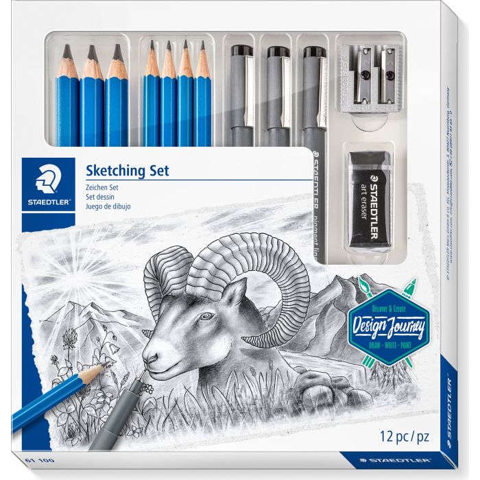 Inklusive en mängd högkvalitativa STAEDTLER-produkter, Grafitpennorna är tillverkade av certifierat trä från hållbart förvaltade skogar. Innehåller: 7 skisspennor i sorterade hårdlekar 3 pigment liner i olika bredder 1 radergummi 1 pennvässare Miljöinfo: PEFC-certifierad.