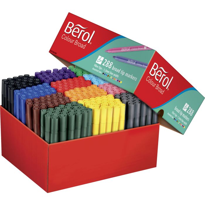 Tuschpennor Berol Broad med rund bred spets som är speciellt användbar vid teckningar och andra arbeten när det ska vara grövre linjer och större ytor som ska fyllas. Även lämplig till de som är yngre. -- Sorterade färger -- Rund bred spets -- Linjebredd: 1,7 mm -- Finns i flera olika antal/fp -- Miljöinfo: Vattenbaserat