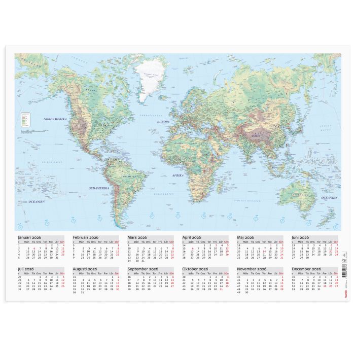 Tidszoner. Skala 1:50 000 000 --Väggkalender 2026 från Burde --Format: 850x630 mm --Layout: År/blad --Kalendarium: 2026-01-01–2026-12-31 --Innehåll: Årsöversikt/årsöversikter. --Antal sidor: 2 --Miljöinformation: FSC®