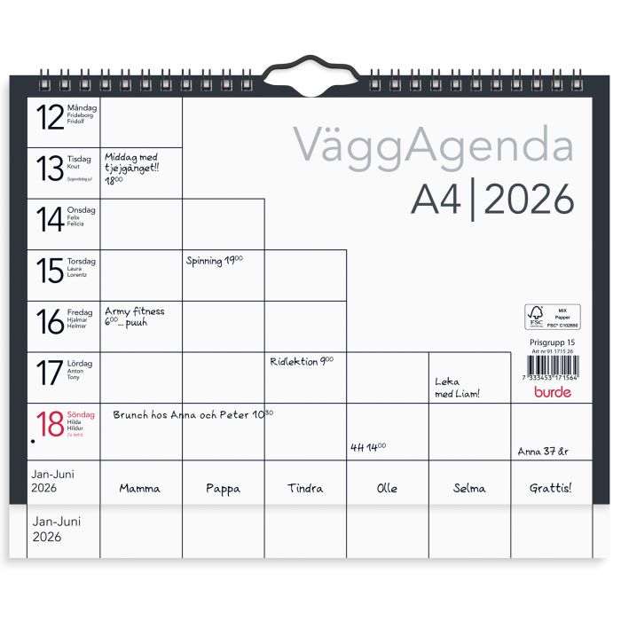 Väggkalender agenda från Burde, spiralbunden och en vecka per blad. --Väggkalender 2026 från Burde --Format: A4 --Layout: Vecka/blad. Spiralbunden. --Kalendarium: 2025-12-29–2027-01-03 --Innehåll: 6 kolumner, Kyrkliga helgdagar, Flaggdagar, Helgdagar/aftnar, Månfaser, Namnsdagar, Temadagar/händelser, Årsplan/årsplaner. --Antal sidor: 52 --Miljöinformation: FSC®
