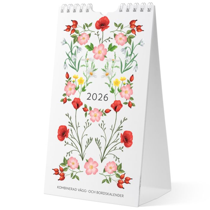 Liten, lättplacerad väggkalender och bordskalender i ett! Häng den på väggen eller veckla ut kartongbakstycket och ställ den på skrivbordet. Kalendern har söta blomstermotiv. Två olika layouter syns samtidigt varje månad när den står på bordet, varav den ena layouten har mer anteckningsyta. Välj vilken layout du vill ha när du hänger den på väggen. --Väggkalender 2026 från Burde --Format: 120x215 mm --Layout: Månad/blad --Kalendarium: 2026-01-01–2026-12-31 --Spiralbunden --Innehåll: Flaggdagar, Helgdagar/aftnar, Månfaser, Namnsdagsregister, Temadagar/händelser. --Antal sidor: 12 --Miljöinformation: FSC®