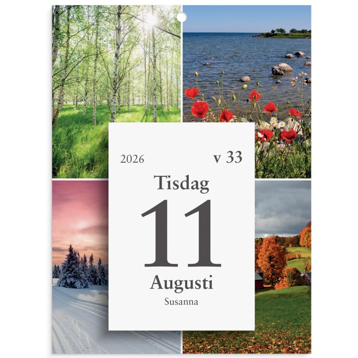 Med dagblocket Årstider från Burde kan du följa året genom att riva av blad efter blad. Kalendern har ett väggplån som bakstycke med bilder på de fyra årstiderna, samt ett dagblock. Dagblocket visar en vardag per blad och lördag och söndag på samma blad. Limbundet med klammerbaksida. --Kalender 2026 från Burde --Format: 130x175 mm --Layout: Dag/sida. Limbunden. --Kalendarium: 2026-01-01–2026-12-31 --Innehåll: Kyrkliga helgdagar, Flaggdagar, Helgdagar, Månfaser, Namnsdagar. --Antal sidor: 318 --Miljöinformation: FSC®