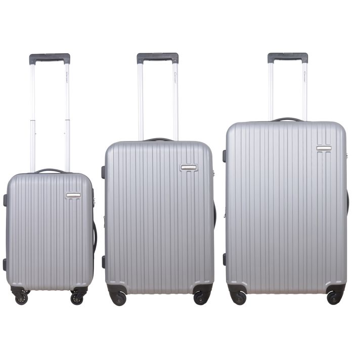 Rhodos från Cavalet är en modern och praktisk resväska, perfekt för dig som älskar att resa. Rhodos erbjuder mycket väska för pengarna och säljs endast i ett set om tre väskor i olika storlekar. Väskan har gummerade bärhandtag och justerbara teleskophandtag för extra bekvämlighet. De fyra lättmanövrerade hjulen gör resan smidig, och det tresiffriga kodlåset ger extra säkerhet. Invändigt är väskan helfodrad, med ett stängbart fack på ena sidan och justerbara packningsband på den andra, så att du enkelt kan hålla ordning på dina saker. Detta set består av 3 olika resväskor: